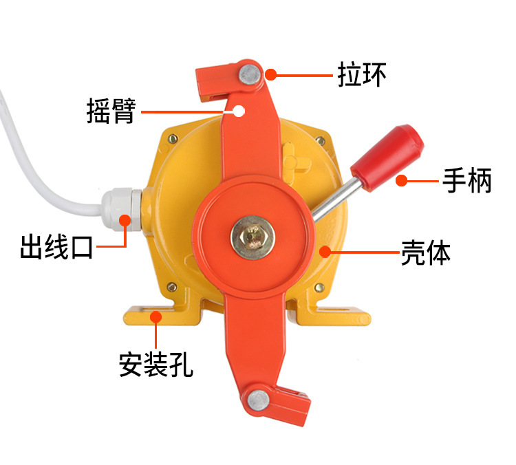當膠帶運輸機現(xiàn)場緊急事故時,在沿線任意位置牽動系在掛耳上的鋼絲繩,迫使機內(nèi)凸輪轉(zhuǎn)動而驅(qū)動微機開關(guān)動作,發(fā)出停機信號,達到停機效果,防止事故的擴大。